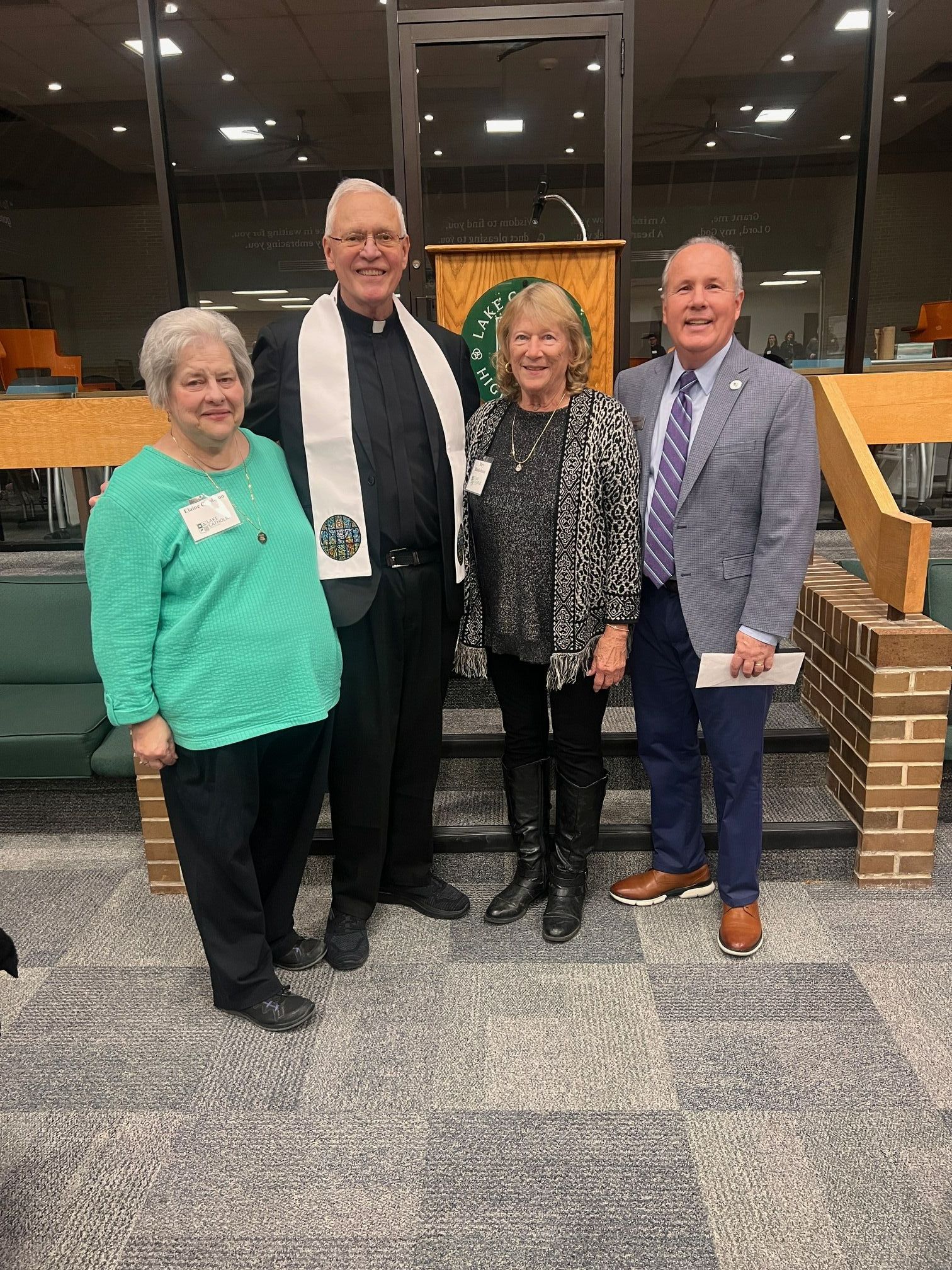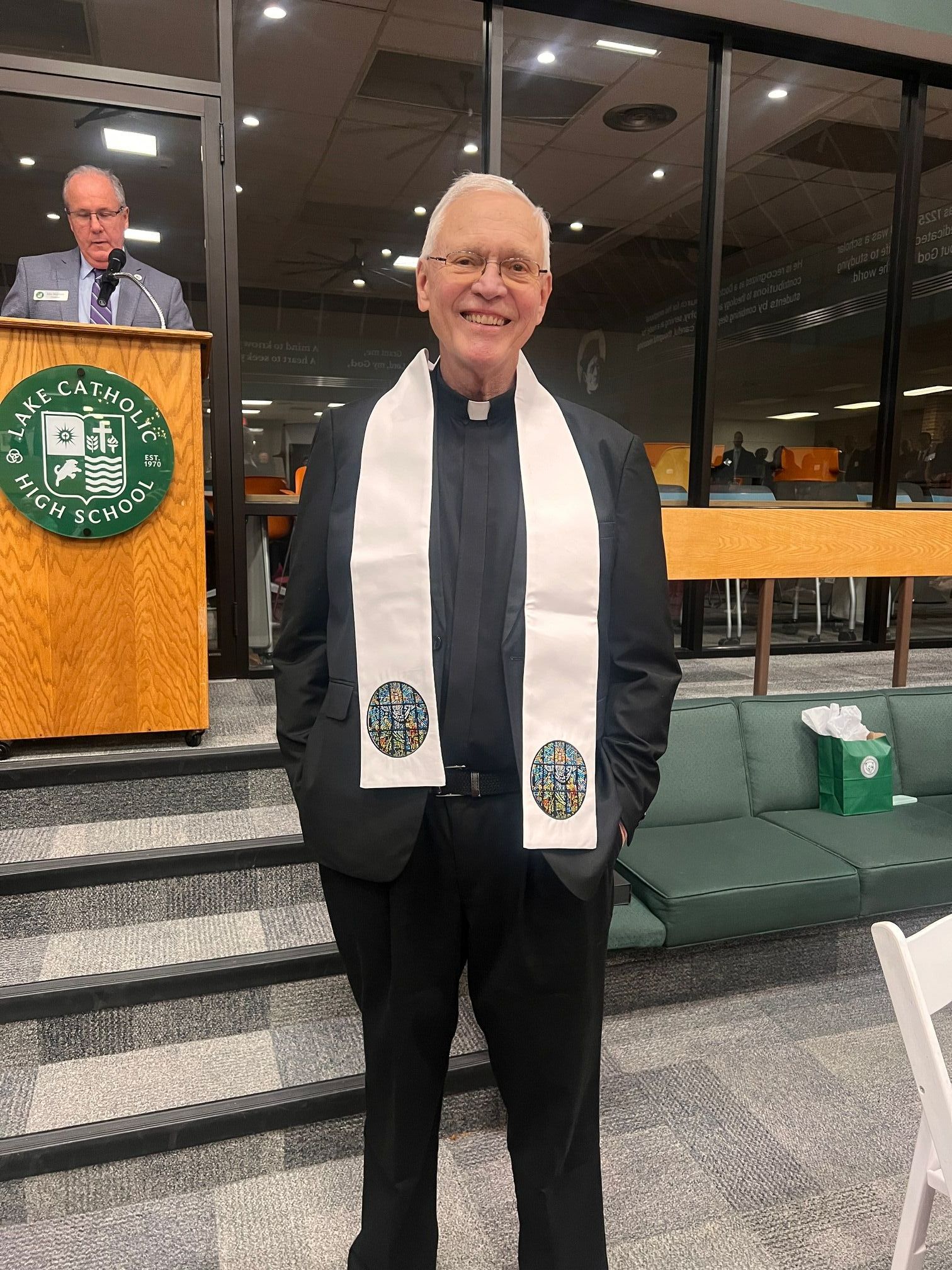 Fr. Johns received a crystal flame award to commemorate this special recognition. In addition, he was presented with a hand-embroidered stole featuring elements of Lake Catholic’s stained-glass artwork. The stole symbolizes faith, service, and a lasting connection to the school. Fr. Johns joins Fr. Marty Polito, Lake Catholic’s inaugural Torch of Loyalty honoree, as the only recipients of this stole — a distinction that reflects the profound and enduring impact of their ministry on Lake Catholic.