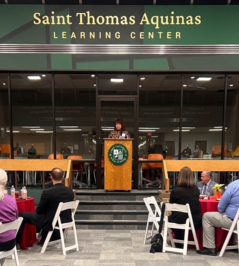 The stained glass windowpanes that grace the St. Thomas Aquinas Learning Center are sections from the original SJV Church building donated by Fr. Johns. Additionally, after many conversations with him about growing Catholic identity at Lake Catholic in the early 2000s, he was instrumental in suggesting, supporting, and celebrating the selection by student vote of the school’s patron saint, St. Thomas Aquinas — the patron of scholars. The evening's event in that space, in the center of this school, in the presence of visible displays of St. Thomas Aquinas, is because of him, his support, and his joyful efforts, Bernot said.